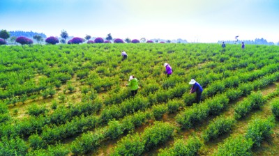 3月25日,郎溪县毕桥镇施宏村黄魁茶叶主产地,茶农正在采摘今春第一茬 “明前茶”。黄魁茶是当地和安徽农业大学合作改良的新品种,目前施宏村种植面积2800亩,2016年茶叶收入突破2000万元。眼下已进入春茶上市季,我省各茶叶主产区茶农抢抓时机采制 “明前茶”。