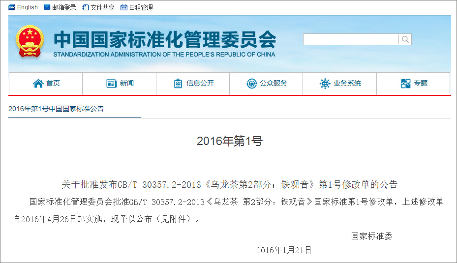 铁观音-陈香.doc (原文下载) 关于批准发布GB/T 30357.2-2013《乌龙茶 第2部分:铁观音》第1号修改单的公告 国家标准化管理委员会批准GB/T 30357.2-2013《乌龙茶 第2部分:铁观音》国家标准第1号修改单,上述修改单自2016年4月26日起实施,现予以公布(见附件)。 附件如下: GB/T 30357.2-2013《乌龙茶 第2部分:铁观音》第1号修改单 一、增加条款:“4.1.3陈香型铁观音:以铁观音毛茶为原料,经过拣梗、筛分、拼配、烘焙、贮存五年以上等独特工艺制成的具有陈香品质特征的铁观音产品。” 二、增加条款:“5.2.3陈香型铁观音各级感官指标应符合表3的要求。” ————————————— 印送:各省、自治区、直辖市质量技术监督局,总局各直属检验检疫局,国务院各有关部门、行业协会、集团公司,总局各司(局)、直属挂靠单位,全国各直属标准化技术委员会。 —————————————————————— 国家标准化管理委员会办公室 2016年1月26日印发 ————————————— |